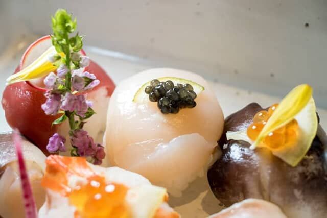 写真中央のホタテにはサッパリとしたスダチとゴージャスなキャビアをトッピング。左側のマグロの赤味にはラディッシュ、右の鳥貝にはイクラとレモンが飾られるほか、それぞれネタとの相性を考えたトッピングもカラフルです。