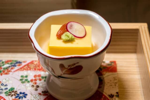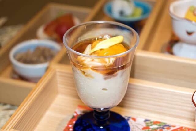 かぼちゃを使ったお豆腐には、牛乳と共に鰹と昆布で作った喰出汁を隠し味に忍ばせています。少量の塩などを加え、かぼちゃの甘みとミルク感を引き立てています。