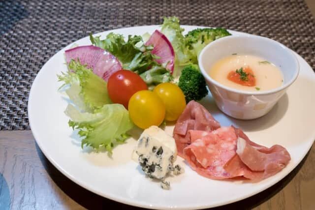 ビュッフェからはシャキシャキで瑞々しいサラダにくわえ、上品な出汁の味わいが凝縮した冷製茶碗蒸しの小鉢をピックアップ。美味しそうなブルーチーズや生ハムなども選びました。