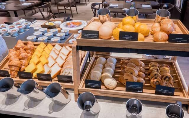 レストラン「ライブラリー」での朝食は、メイン料理をひとつ選ぶセミビュッフェスタイル。8種類のメニューからオムレツなどの卵料理やパンケーキ、京すぐき入りリゾットなどから1つを選びます。京の朝鍋は夏になると鱧しゃぶを楽しめるそう。自由に選べるビュッフェ台には季節の野菜や果物、小鉢料理など和洋のメニューが並び種類も豊富です。