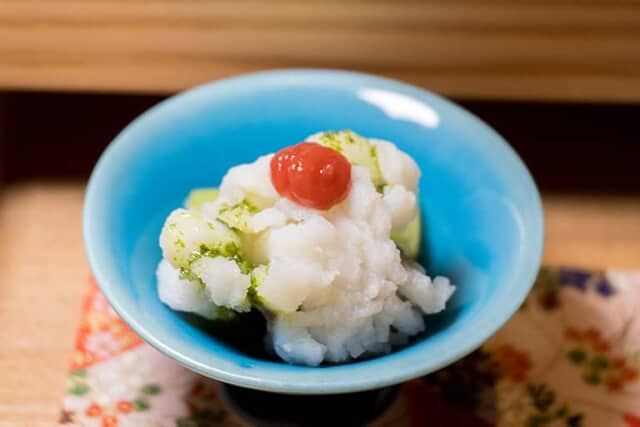暑い季節の京都といえば鱧。ハスイモのずいき(葉柄)を出汁と絡めたソースがかかり、梅肉も添えられてさっぱりといただきました。