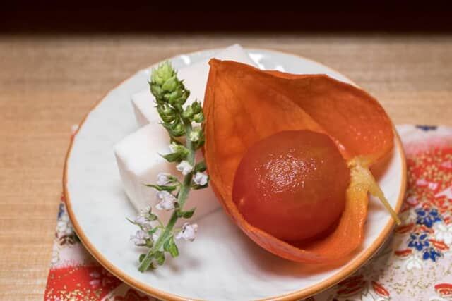 エビのすり身で作ったしんじょを添えた、ミニトマトは色鮮やか。砂糖とレモンのシロップで煮た湯剥きトマトを、夏を彩るホオズキの実に見立てます。優しい甘さとさっぱりとしたレモンが後を引く一品です。