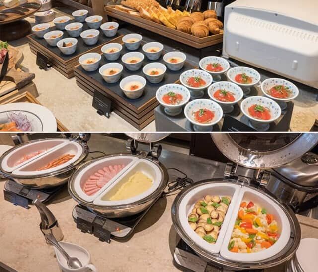 朝食はテラス席でもいただけるほか、朝食後のコーヒーのみのテラス利用も可能です。レストランの中央にあるビュッフェテーブルには、冷製茶碗蒸しなど彩りのいい小鉢料理が用意され、温野菜やハム、ソーセージ、ベーコンなどのホットプレートも並びます。