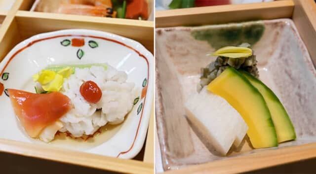 ▲鱧と北寄貝の酢の物とお漬け物