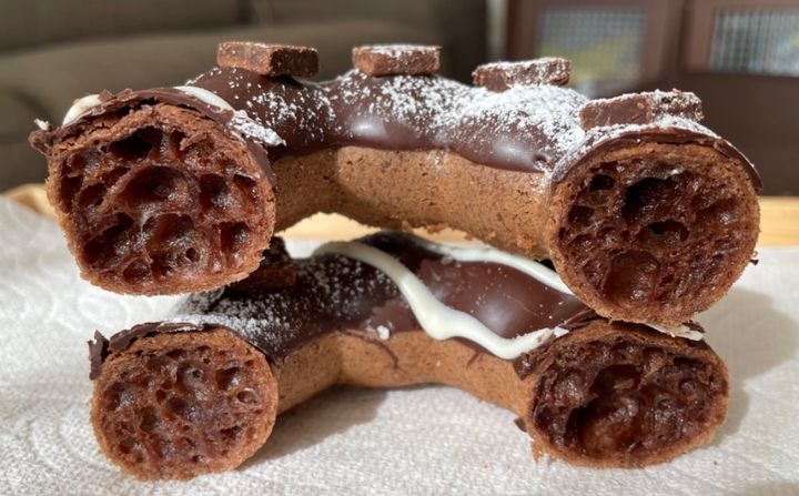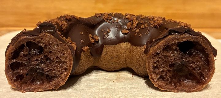 カスタードのコクとチョコが香る濃厚なショコラカスタードクリームを絞り、チョコレートをコーティング。仕上げにチョコクランチをトッピングしたポン・デ・ショコラです。