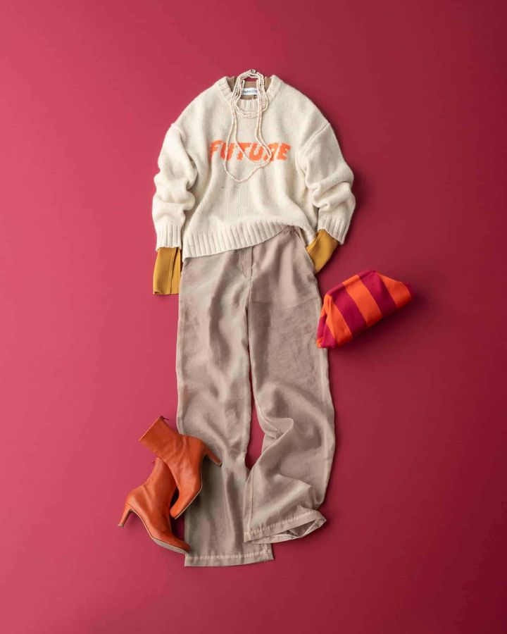 ニットの袖のカラーを使ったレイヤードがポイント。カシミア素材のロゴニットを重ねてカジュアルにした分、シアーパンツの透け感とじゃら付けパールネックレスで華やかなお出掛けムードを演出しました。ショートブーツとバッグの色をロゴのオレンジと揃えて、遊びがありつつもまとまりのあるコーディネートに。