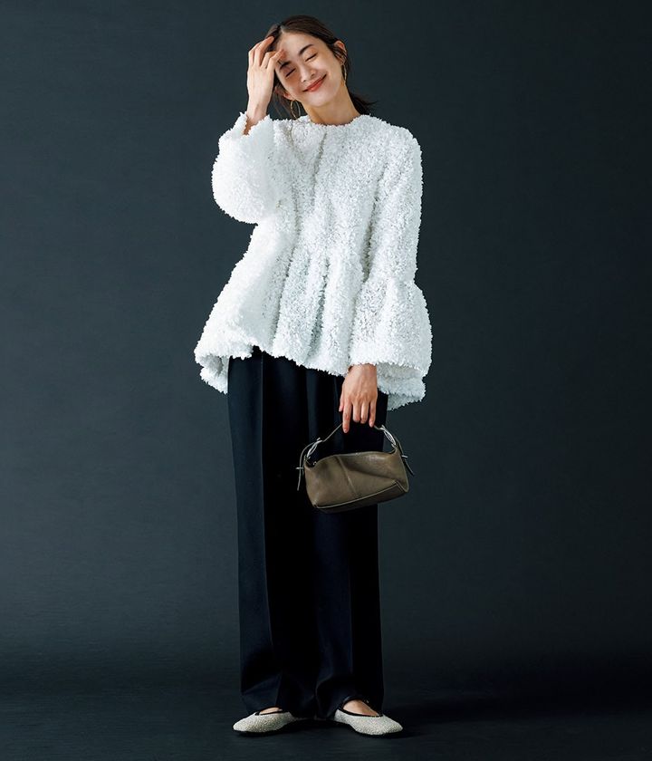 トップス¥57,200(ツル バイ マリコ オイカワ)パンツ¥44,000(グラフペーパー/グラフペーパー 東京)バッグ¥121,000(J&M デヴィッドソン/J&M デヴィッドソン カスタマーセンター)シューズ¥11,550(ル タロン/ル タロン 有楽町マルイ店)ピアス¥32,560(ソコ/ズットホリック)