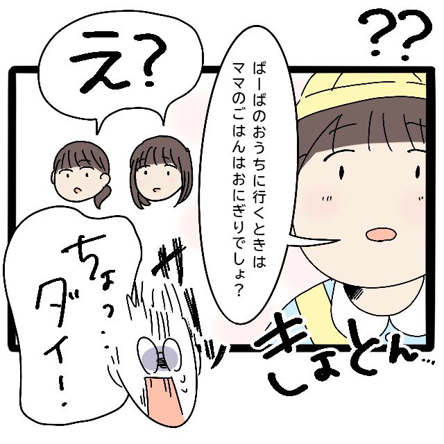 「アイも明日ばーばの家に行くよー」と話すお友達のアイちゃん。するとダイは「アイちゃんのママ、おにぎり作らないとだ~!」と言いました。アイちゃんのお母さんは不思議そうに「おにぎり?」と問いかけます。