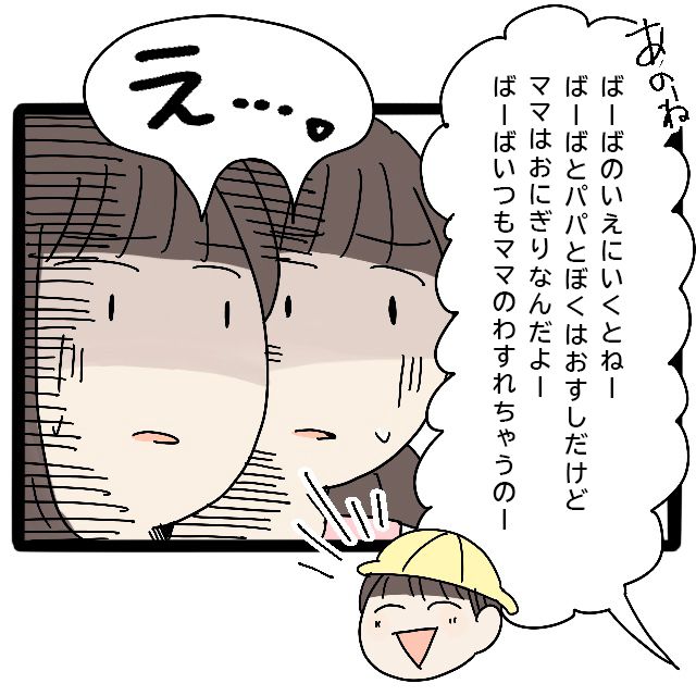 ダイはきょとんとした顔で「ばーばのおうちに行くときは、ママのごはんはおにぎりでしょ?」と聞きました。すると近くにいたママ友が、「え?」と言います。夫は顔を青ざめて「ちょっ・・・ダイ!」と止めに入ろうとします。