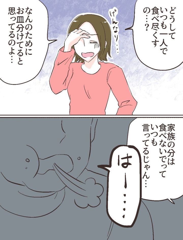 私は、何度目かの注意にげんなりしながら、「どうしていつも1人で食べ尽くすの?なんのためにお皿分けてると思ってるのよ、家族の分は食べないでっていつも言ってるじゃん」と言いました。するとフトシは、わざとらしく「はー・・・」と大きなため息をつきました。