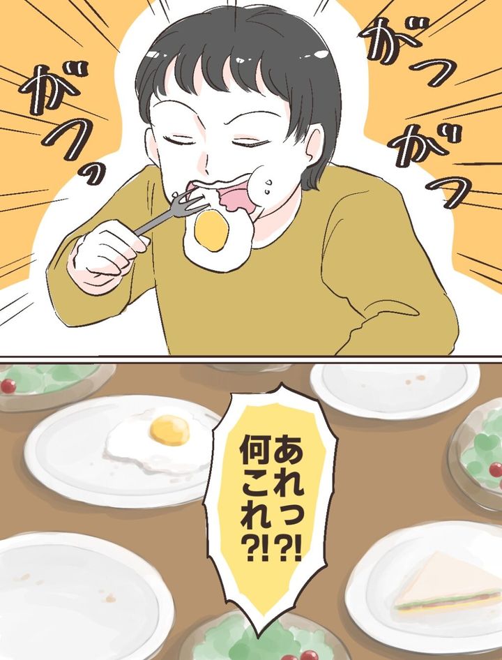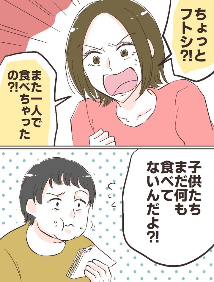 「ちょっとフトシ、また1人で食べちゃったの!?子どもたちまだ何も食べてないんだよ!?」私は黙々と食べ続けるフトシに食べるのをやめるよう伝えますが、彼は他人事のような顔をして、ついに最後のサンドイッチにも手をつけてしまいました。
