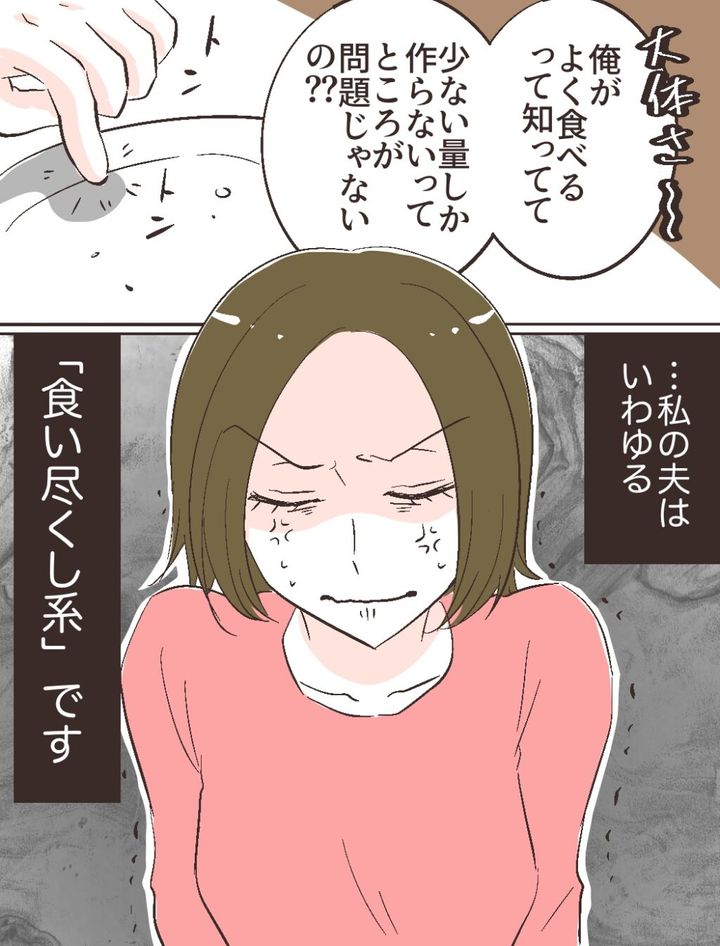 ヒカリさんは、夫フトシさんの底なしの食欲に悩まされていました。今朝も朝食を並べたそばからフトシさんが勢い良く食べ始め、気付いた時には人数分用意した食事はきれいさっぱり皿の上から消えていました。ヒカリさんは頭を抱えながら、「どうして1人で食べ尽くすの?家族の分は食べないでって言ってるよね」と聞きます。するとフトシさんは、わざとらしくため息をついて「朝からそうやってイライラさせられる身になってよ?やる気無くすわ~!」と、まるで自分が被害者であるかのように言いました。それどころか「大体俺がよく食べるって知ってて少ない量しか作らないのが問題じゃないの?」と、ヒカリさんを悪者に仕立て上げる始末。フトシさんは、いわゆる「食い尽くし系」。何度言っても直らないフトシさんに、ヒカリさんはお手上げ寸前です。