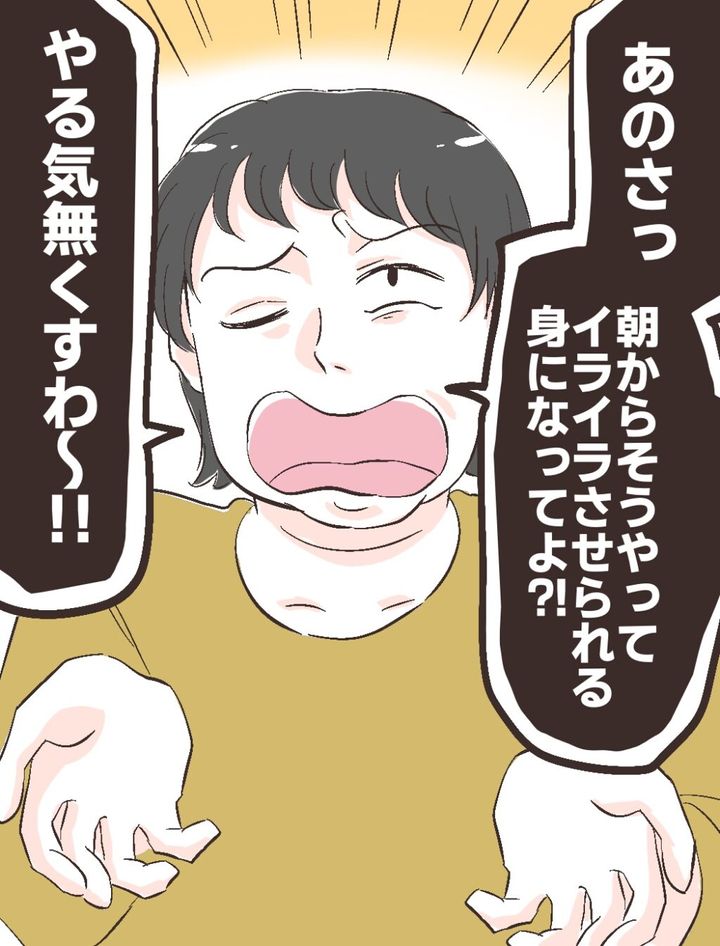 フトシは胸元で大げさに手を広げ、「あのさっ朝からそうやってイライラさせられる身になってよ!?やる気無くすわ~!」と、まるで自分が被害者であるかのように言いました。