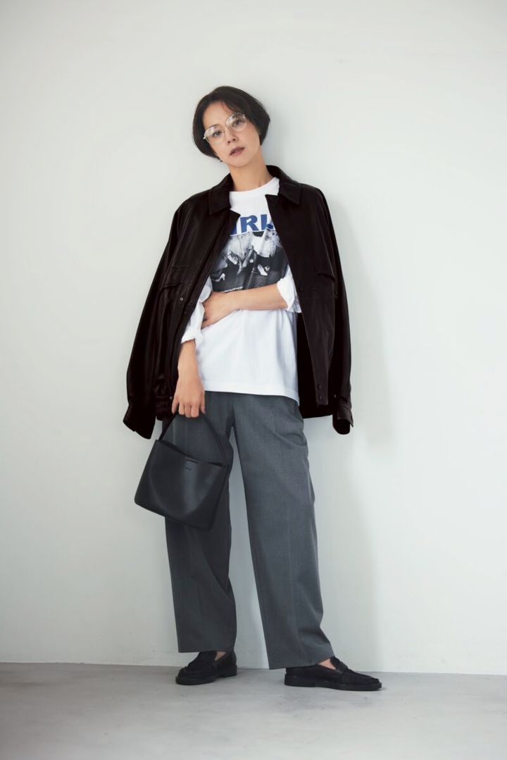 ブルゾン17万6000円(ゲミニー/ウィムガゼット ルミネ新宿店) Tシャツ7480円(グッド ロック スピード/グッドスピード) パンツ4万7300円(グリードインターナショナル) 眼鏡2万1450円(コーチ/ルックスオティカジャパン カスタマーサービス) バッグ3万5200円(ロー ソウル) ローファー2万2000円(モリーニ/ジャック・オブ・オール・トレーズ プレスルーム)