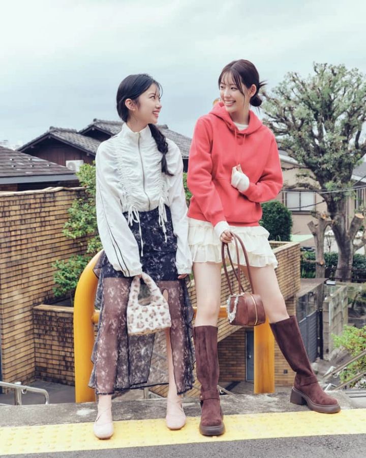 〈右・里帆のコーデ〉ロングブーツ 18,700円/rienda(バロックジャパンリミテッド)フーディスエット 5,445円/United Athle(キャブ)なかに着たシアートップス 6,930円/GIUNON(アンティローザ)シフォンスカート 3,190円/emsexcite(R1000)バッグ 11,000円/dazzlin バッグチェーン 3,080円/lilLilly(lilLilly TOKYO)〈左・琉のコーデ〉バレエシューズ 5,410円/Birthdayroom(アンティローザ)ブルゾン 9,900円、シアーワンピース 10,890円/ともにSPIRALGIRL バッグ 8,800円/RESEXXY