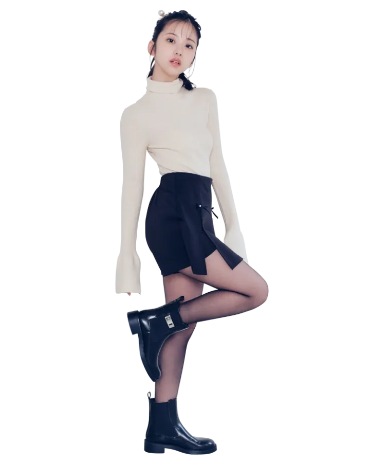 タイツ 1,100円/靴下屋(Tabio)ハイネックニット 4,500円/Olu. ミニスカート 9,790円/ROYAL PARTY ヘアピン(2個セット)1,980円/GOLDY ショートブーツ 12,900円/チャールズ&キース(チャールズ&キース ジャパン)