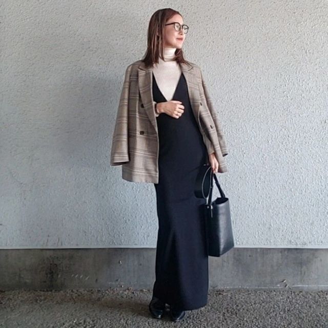 チェック柄ジャケットはコーデがごちゃつきがちですが、「同色のニット×スカート」に羽織ればスッキリ見え。というのも同色を組み合わせることで上下の服に繋がりが生まれ、Iラインシルエットを強調したワンカラーコーデに。これならチェック柄ジャケットをスマートかつきれいめに着こなせます。