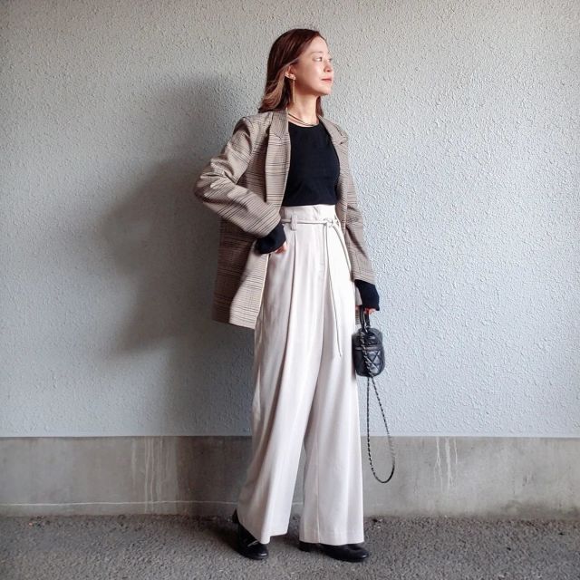チェック柄ジャケットにワイドパンツを合わせるときは「ぴったりめのクルーネックニット」を投入。ボリューミーなパンツが落ち着き全身のバランスが整います。しかもチェック柄ジャケットが大げさに見えず、コーデに馴染みますよ。