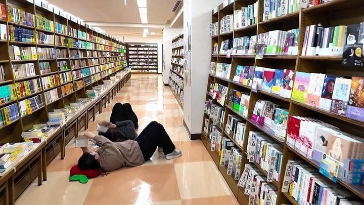 本屋さんで、あろうことか、床の上やベンチに寝そべって、本を読む人たち。