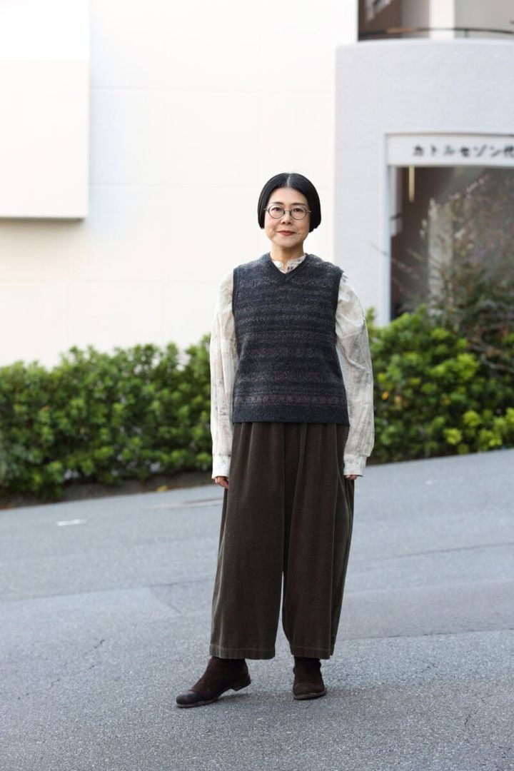 チャコールグレーをベースにしたフェアアイル柄のベストは、シャツやブラウスに重ねても、ジャケットやコートのインに着ても存在感があります。「絵を描くのが仕事なので、腕まわりがフリーなニットベストはよく着ます」と須田さん。