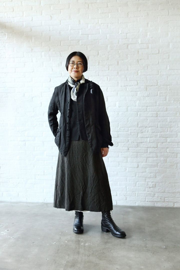「月曜日はジャケットを着ると気持ちがキリッとします」と須田さん。硫化染めのリネンジャケットはニュアンスのある黒で、さっとはおるだけで決まる一着。インに着たのは、「動物に負担をかけないように毛の刈り方を工夫したノンミュールジングウールのベスト」(須田さん)。上半身をコンパクトにして、スカートはボリュームのあるフレアスカートでバランスをとります。「このスカートは、スローライフを意識したエコウール素材でつくりました」と須田さん。カットオフしたアンダースカートの白と、スカーフの白でこなれた印象になります。異素材を組み合わせた着こなしは、きちんと感がありながら、細部に遊び心をプラス。マニッシュなオフィスコーデに注目です。