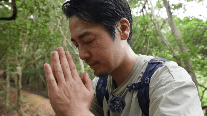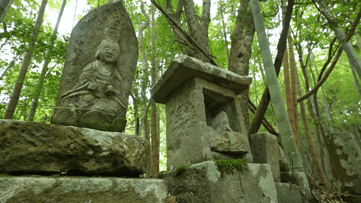 歩みを進めるうち、そこかしこに石仏が置かれていることに気づいた福士さん。その一つ一つに何やら番号らしきものが刻まれています。行く先々で出迎えてくれる石仏、その数なんと八十八ケ所。実はこれらの石仏は四国八十八ヶ所霊場を模して設置されたもので、古来より八十八ヶ所の石仏を巡ることで煩悩を打ち消すことができると信じられてきました。福士さんも手を合わせつつ山登りを続けます。