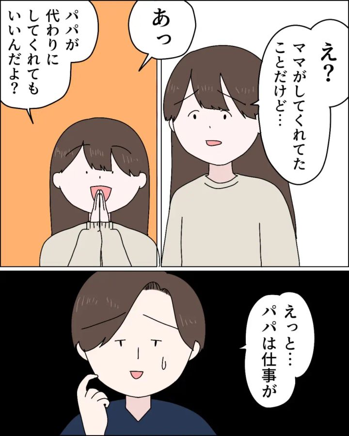 「え?ママがしてくれてたことだけど・・。あっ、パパが代わりにしてくれてもいいんだよ?」ジュリちゃんの言葉に、「えっと・・パパは仕事が」とケイさんが焦りながら答えました。