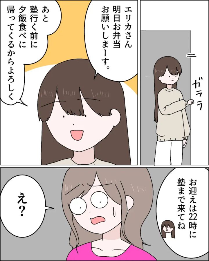 すると、寝室のドアが開き、「エリカさん、明日お弁当お願いしまーす。あと塾行く前に、夕飯食べに帰ってくるからよろしく。お迎えは22時に塾まで来てね」とジュリちゃんが言うと、「え?」と驚くエリカさん。