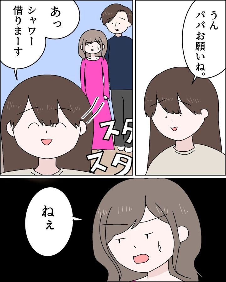 「うん。パパお願いね」そう言うと、「あっ、シャワー借りまーす」そう言ってスタスタとバスルームへと歩いて行くジュリちゃんを見送ると、「ねぇ」と話を切り出すエリカさん。