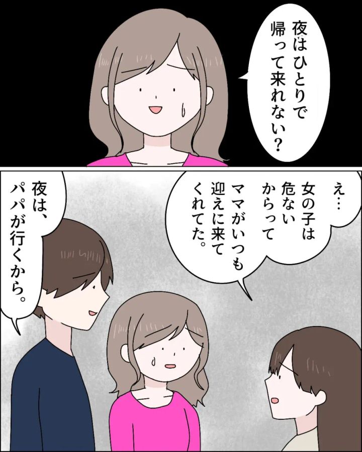 「夜はひとりで帰って来れない?」エリカさんにそう言われ、「え・・女の子は危ないからって、ママがいつも迎えに来てくれてた」と主張するジュリちゃんに、「夜はパパが行くから」とケイさんが言うと、
