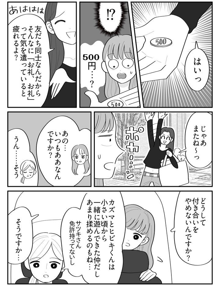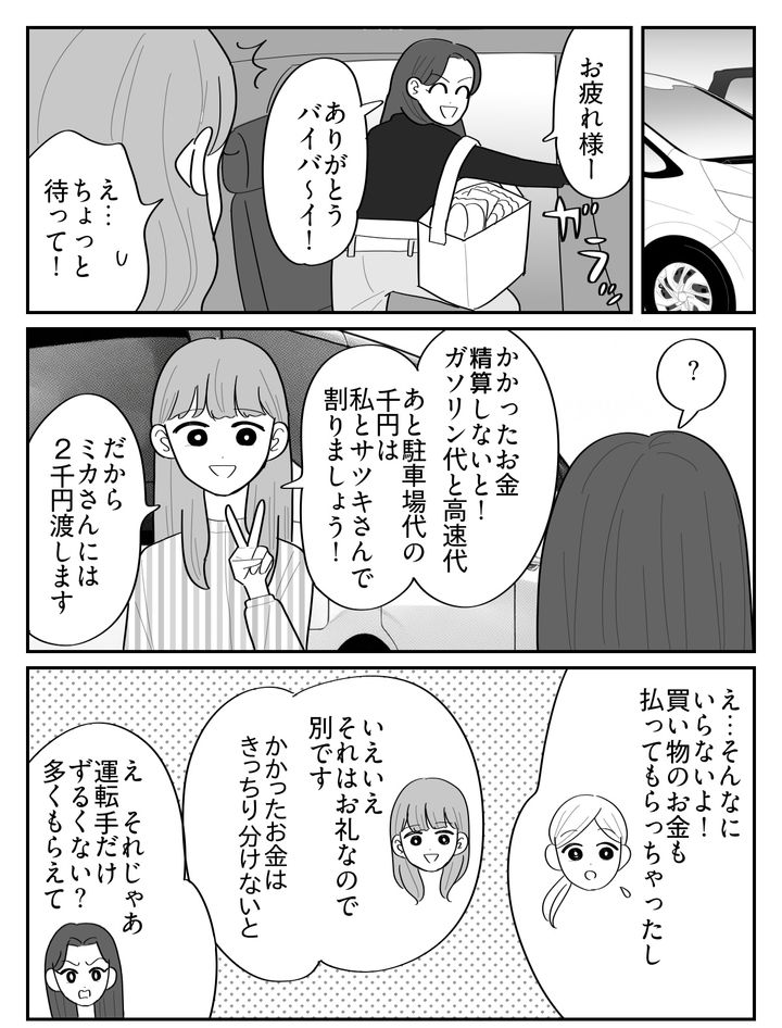 車を出してくれたミカさんを「運転手」呼ばわりして、お礼をもらえるのが「ズルい」? この人、いったいなにを言っているの……!? あまりに非常識な言葉を聞いて、私は混乱してしまいました。そしてサツキさんが差し出したのは……。