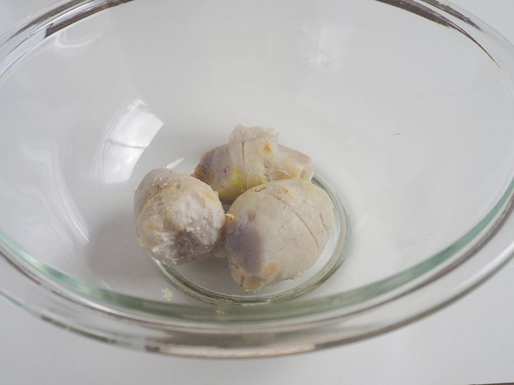 1. 里芋を水で洗い、里芋(濡れたままにする)に包丁で一周切り込みを入れる。耐熱ボウルに加えてラップをし、電子レンジ(600W)で4分程度(中がトロトロ状態になるまで)加熱する。粗熱をとり、手で触れるようになったら、皮を剥く。