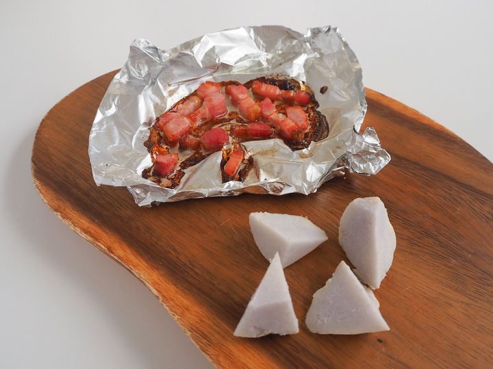3. トッピング用の里芋は小さめの乱切りにする。ベーコンはアルミホイルにのせ、トースター(1000W)で8分程度、カリカリになるまで焼く。
