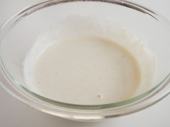 2. 皮を剥いた里芋1/2個(トッピング用)を除き、フォークでしっかり潰す。そこにクリームチーズを加えてしっかり潰し混ぜ、さらにAを加える。電子レンジ(600W)で3分加熱する。フォークで里芋の形がなくなるまで潰し、よく混ぜてザルで濾す(あればハンドブレンダーでペースト状にする)。