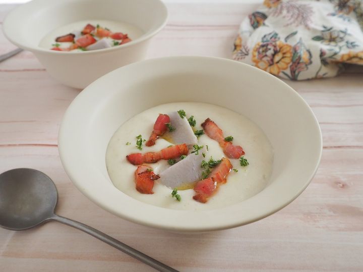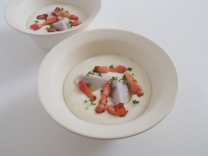 トッピングには、ごろっと存在感のある里芋と、カリカリに焼いたベーコンを浮かべて。里芋のとろとろ感とホクホク感の2つの顔を一度に楽しめるスープです。