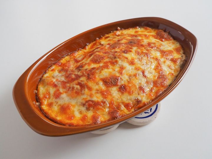 3. 耐熱皿に2を加える。ミートソースを広げ、その上にピザ用チーズを広げる。1000Wのトースターで10分~こんがり焼き目がつくまで焼く。