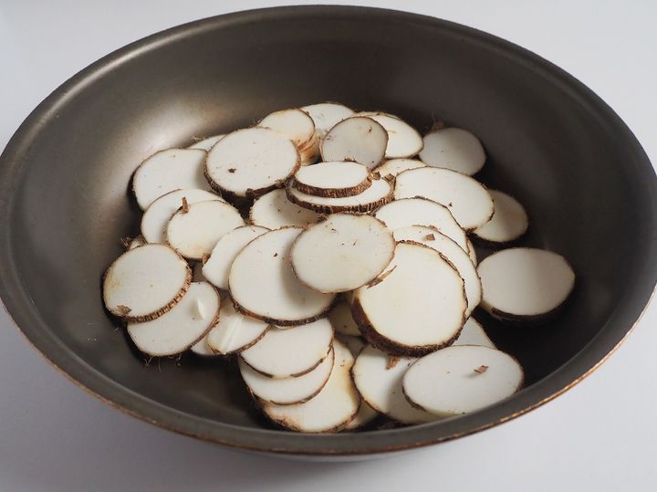 1. 里芋はタワシなどでよくこすり洗いする。硬い部分は切り落とし、スライサーでフライパンに直接スライスする。