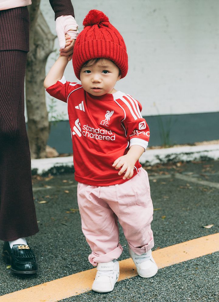 NAME:翔平くん・1歳イングランドのリヴァプールFCのユニフォームにピンクのパンツを合わせて、トレンドのブロークコアを満喫中の翔平くん。トップスに合わせて真っ赤なニット帽を投入して、赤×ピンクのツートーンコーデに。足元は定番人気の『コンバース』で、元気いっぱいのスタイルが完成!item▼