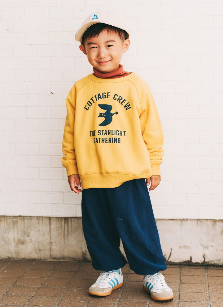 NAME:つむぎくん・3歳アメカジムードたっぷりの『コドモ ビームス』のスウェットに、ゆるっとボトムを合わせた最旬ストリートスタイル。インナーのタートルネックを襟元からチラ見せするテクニックもお見事。仕上げにスポーティなキャップをプラスすれば、周りと差がつくイマドキおしゃれボーイに。item▼