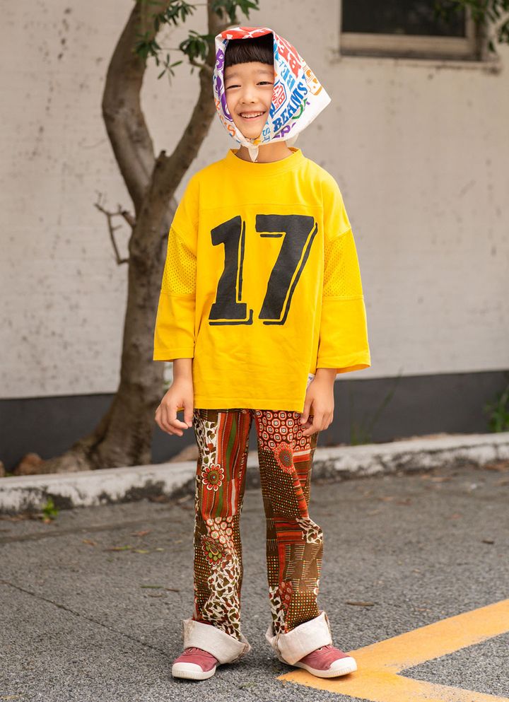NAME:といろくん・6歳元気いっぱいなビタミンイエローのナンバリングTシャツが目を引く、といろくん。パッチワーク風のレトロなパンツで遊び心をプラス。真知子巻きにしたお茶目なバンダナや、ロールアップしたパンツの裾など、Y2Kムードを散りばめた個性たっぷりな着こなしがとっても魅力的♡item▼