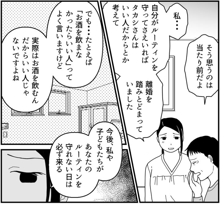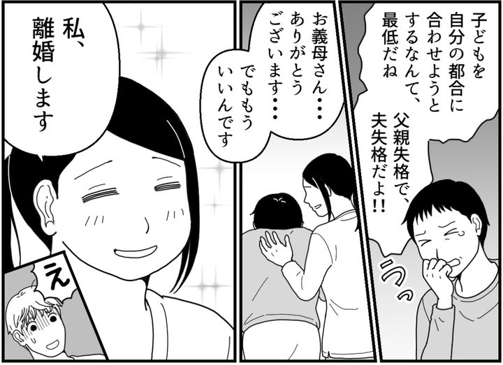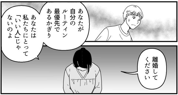 これまでの結婚生活では、どんなに理不尽なことを言われても「離婚」とまでは考えませんでした。子どもが小さいし、夫はルーティンさえ守ればいい人だしと、そんなふうにごまかしていたのです。でも2人目が生まれても変わらない夫を見て……私のなかでハッキリと離婚の意思が固まったのでした。