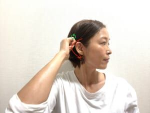 続いて、グーにした手を耳上に移動し、画像の赤線のように耳周りを円を描きながらなぞります。そのまま耳下まで進みます。