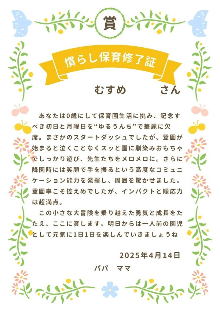 今日、娘の最後の慣らし保育を終えて家に着いてからしばらくして…妻が突然「これから娘ちゃんの慣らし保育修了式をはじめようと思います!」って修了賞を渡してた。もうなんか読んでて僕まで涙涙……明日からパパもママもお仕事頑張ります! X「psypsytuki」(https://x.com/psypsytuki/status/1911716958179119471,2025年11月4日最終閲覧)