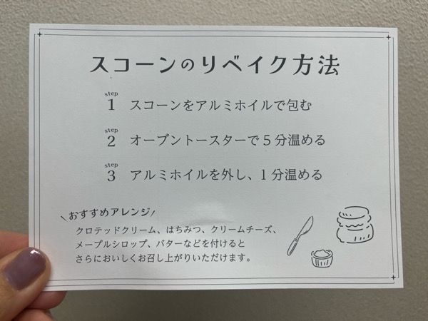 家族にもおいしさを伝えたい! 明日の朝、おいしいスコーンを家でも食べたい! というときには、こちらの案内に従って正しくリベイクしましょう。(笑)