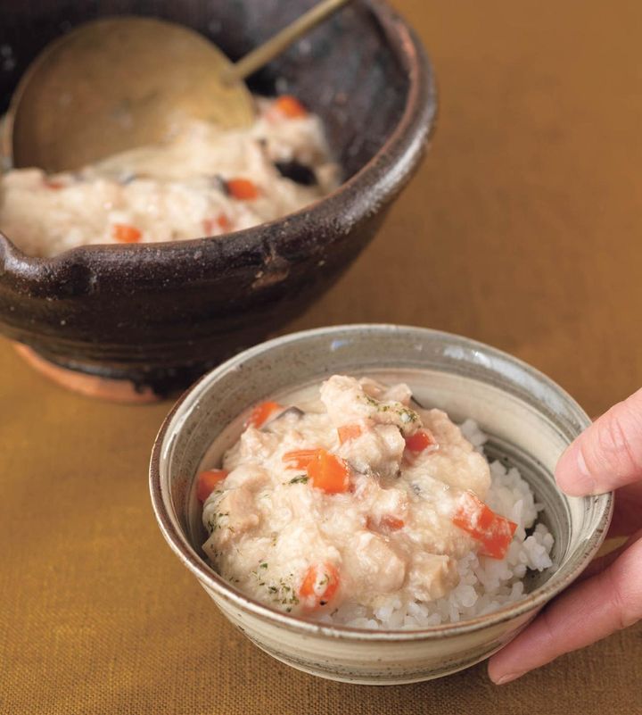 鶏胸肉120gにんじん50gしいたけ2個は1cm角に切り、だし1カップしょうゆ小さじ1塩小さじ1弱で5分ほど煮る。冷めたら、おろした大和芋150gに少しずつ加えてのばし、青のりをふる。ごはんにかけても。