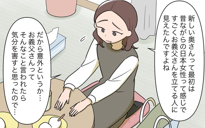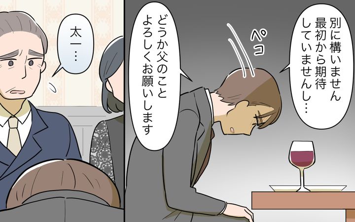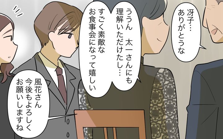 恋人の太一と結婚することになった風花は、太一の母親とは別に、子どもの頃離婚したという太一の父親にも会うことになる。しかし初対面の義父はひどい亭主関白ぶり。しかも最近再婚したという妻の冴子をいきなり合流させてしまう。その後も風花の実家に挨拶がないとクレームの電話を入れたり、太一が風花を結婚相手として選んだことを「まともじゃない」と言ってくるなど、トラブルが尽きなくて…。その後、体調が回復した義父から、結婚のお祝いで高級ホテルのレストランに招待されると、今度は義父の再婚相手から太一へ「相続を放棄してほしい」と打診され…。