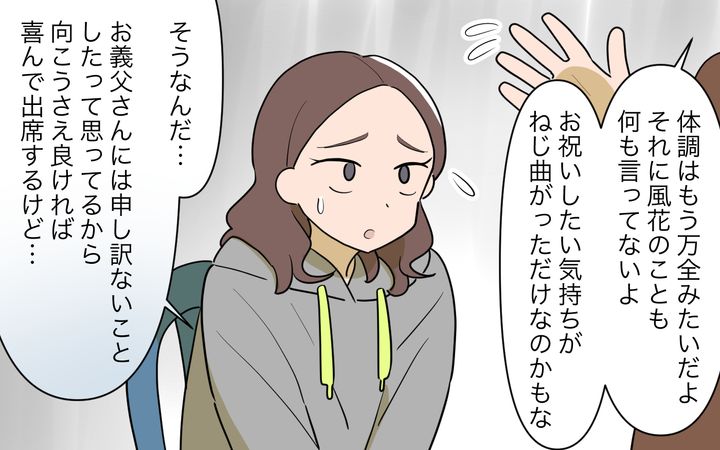 風花は恋人の太一との結婚が決まり、太一が子どもの頃に離婚して、今は1年に一度会っているという義父と対面する。しかし、義父は亭主関白な上に自分勝手で、再婚したばかりだという冴子と自分を太一の両親として結婚式に呼んでほしいと言ってきたり、風花の実家に電話して挨拶がないととがめたりと、太一と風花を困らせていた。そんな中、風邪をこじらせて倒れてしまった義父。冴子に頼まれ、昼間義父の様子を見に行くようになった風花は、義父から毎度、人格を否定されるようなひどい言葉で傷つけられる。それに勘づいた太一に本当のことを打ち明けると、太一は風花に謝罪するのだった。