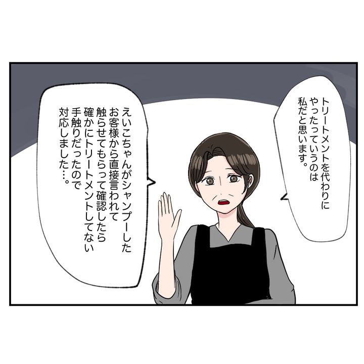 美容師歴8年の主人公はカラー専門店に入社。そこには同い年だけど美容師歴ゼロの「えいこ」が少し先に入社していました。同い年ということもあり仲良くしようと試みるも…、彼女はたびたび問題を起こすトラブルメーカーだったのです。お客様からのクレームに対してえいこに注意すると「あなたの確認不足」と主張。ありえない彼女の言い分に、「自分で出来るから確認はいらない」と言ったこと、さらに確認が必要なら直接頼みにくるのが筋ではないかと伝えるも…。えいこは「はいはい」とため息まじりで流すのでした。