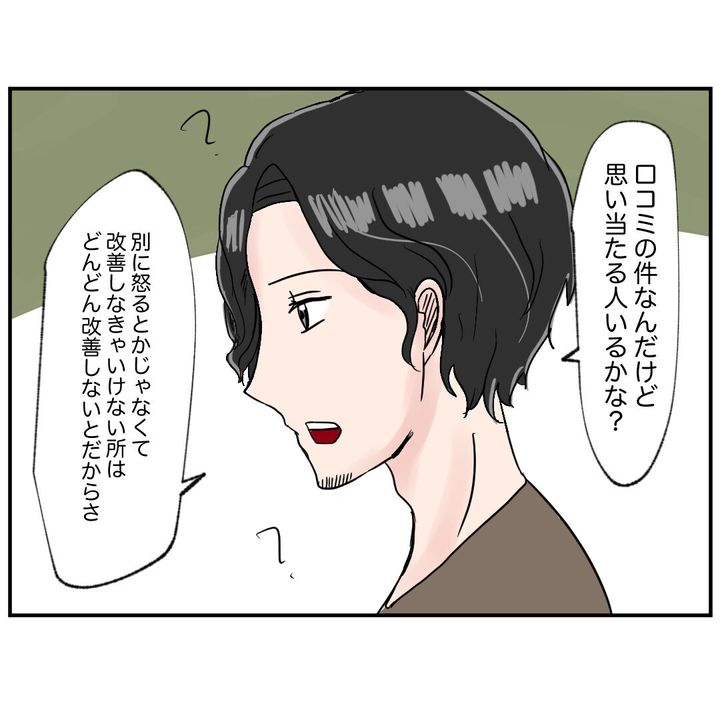 翌日もあらたなクレームが発生し、他のスタッフが対応するも、口コミに悪い評価がつけられてしまいます。後日オーナーが口コミの詳細を確認するため来店。口コミの件について「思い当たる人はいない?」とスタッフに問いかけると、クレームに対応したスタッフがえいこが応対したお客様だったことを告げます。