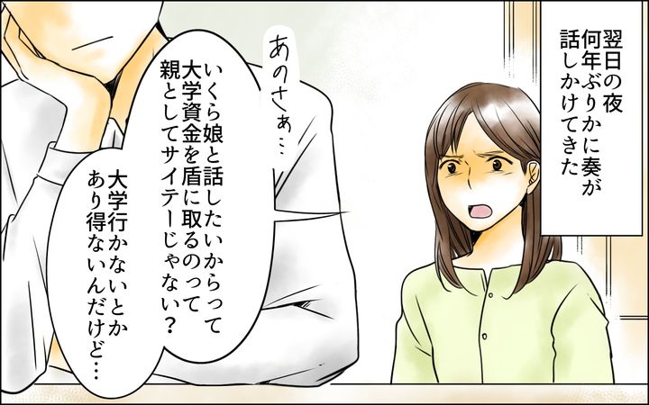 そして母ではらちが明かないと思ったのか、奏から話しかけてきたのですが…。何年ぶりかに娘が話しかけてきた内容は、まるで弓香が話しているかのような口ぶり。父親に対してただ畳みかけるように自分の意見だけを投げつけ、意見が通らなければ親が嫌がるであろう言葉を投げかける。
